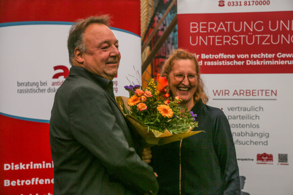 Die Jubiläumsfeier war geprägt von Engagement, Würdigung der Arbeit des Vereins und dem Ausblick auf zukünftige Herausforderungen im Kampf gegen rechte Gewalt und Diskriminierung in Brandenburg. An dieser Stelle möchten wir unseren herzlichen Dank an alle Beteiligten und Unterstützenden richten, einschließlich unserer Kooperationspartner:innen in der Zivilgesellschaft und Wissenschaft, darunter Geflüchteten- und Migrant:innenselbstorganisationen, antifaschistische Initiativen, Migrationsberatungsstellen, Anwält:innen und engagierten Einzelpersonen. Nicht zuletzt gebührt unser aufrichtiger Dank all unseren ehemaligen und aktuellen Kolleg:innen. Mit eurer tatkräftigen Unterstützung konnten und können wir weiterhin unseren Beitrag zur Bekämpfung von Rassismus, Antisemitismus und rechter Gewalt in all ihren Erscheinungsformen leisten. Ihr seid unverzichtbar für unsere Arbeit!