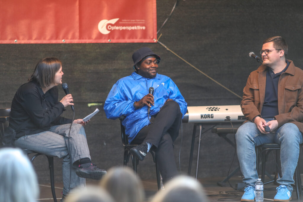 Eine Gesprächsrunde brachte Max Teske und Eric Mbiakeu mit Anne Brügmann, einer Beraterin der Opferperspektive, zusammen. Sie diskutierten die aktuellen Herausforderungen im ländlichen Raum, insbesondere in Bezug auf rechte Dominanz und deren Auswirkungen. Max Teske, ehemalige Lehrkraft einer Schule in Burg (Spreewald), ging gemeinsam mit Laura Nickel im April 2023 mit einem Brandbrief zu Rassismus und rechter Gewalt an ihrer Schule an die Öffentlichkeit. In dem Minitalk teilte er seine Erfahrungen von Anfeindung nach der Veröffentlichung des Briefs.