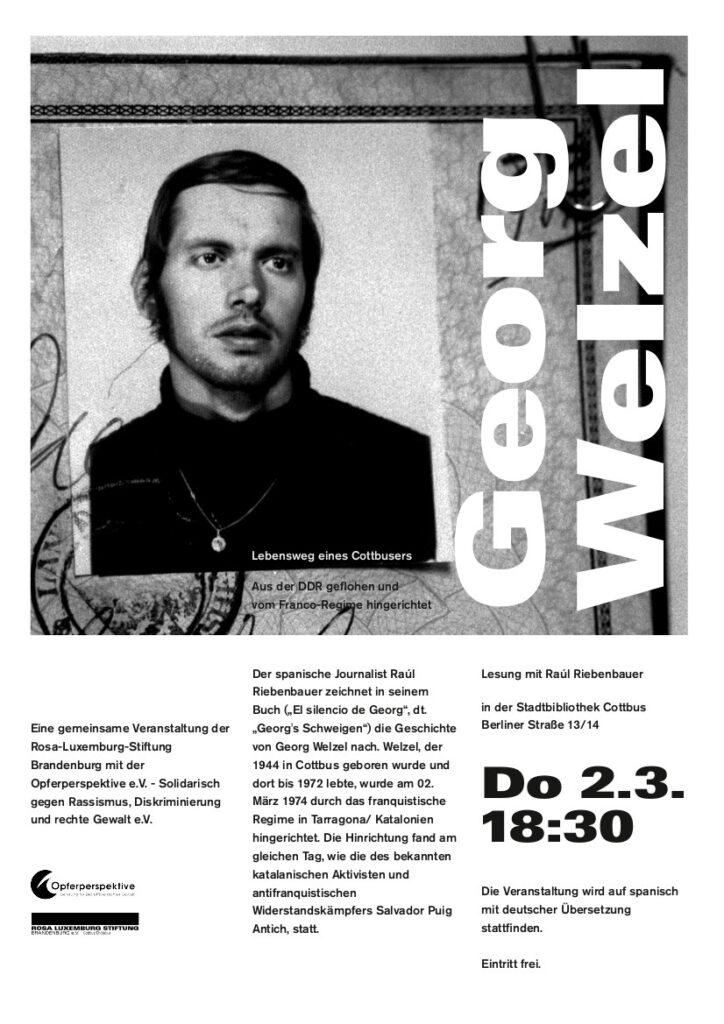 Der spanische Journalist Raúl Riebenbauer zeichnet in seinem Buch „El silencio de Georg“ (dt.: Georgs Schweigen) die Geschichte von Georg Welzel nach. Welzel, der 1944 in Cottbus geboren wurde und dort bis 1972 lebte, wurde am 2. März 1974 durch das franquistische Regime in Tarragona/Katalonien hingerichtet. Die Hinrichtung fand am gleichen Tag wie die des bekannten katalanischen Aktivisten und antifranquistischen Widerstandskämpfers Salvador Puig Antich statt.