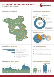 Nach dem drastischen Anstieg seit 2015 kann die Opferperspektive für 2019 einen deutlichen Rückgang bei rechten Übergriffen in Brandenburg vermelden. Die Beratungsstelle registrierte im Jahr 2019 142 rechte Gewaltdelikte, 32 weniger als im Vorjahreszeitraum (174). Damit bewegen sich die Angriffszahlen auf dem – dennoch hohen – Niveau der Jahre 2004 bis 2006.