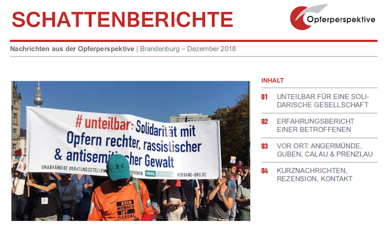 Die neueste Ausgabe unseres Rundbriefes Schattenberichte – Nachrichten aus der Opferperspektive ist noch kurz vor Jahresende erschienen. Wie immer geben wir hier einige Einblicke in unsere Arbeit. Auch dabei ist der Einleger der Antidiskriminierungsberatung Brandenburg.