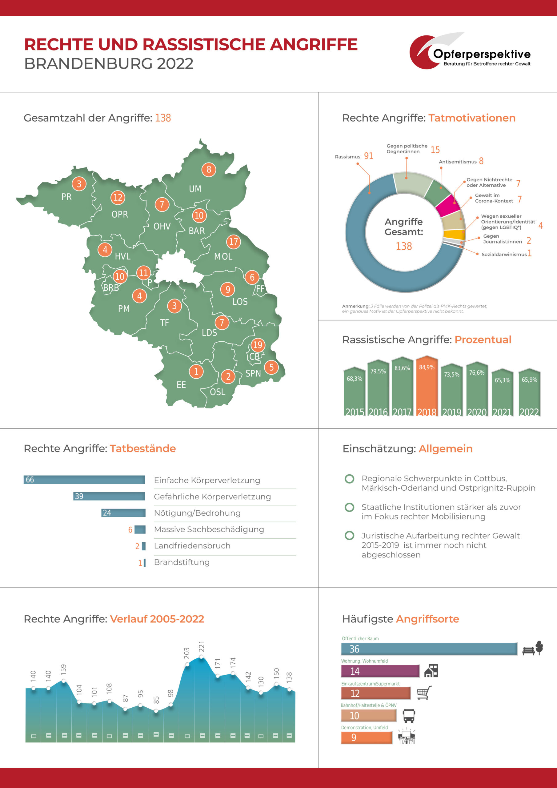 Im Jahr 2022 waren Cottbus mit 19 (2021:16), Märkisch-Oderland mit 17 (2021: 8) und Ostprignitz-Ruppin mit 12 (2021:5) die Landkreise mit den meisten rechten Übergriffen. In allen drei Regionen nahm die Anzahl rechter Angriffe im Vergleich zum Vorjahr zu.