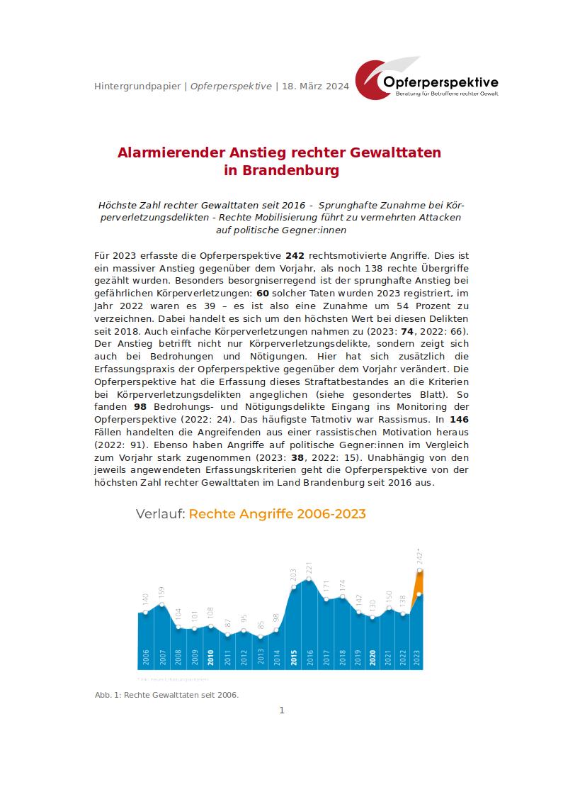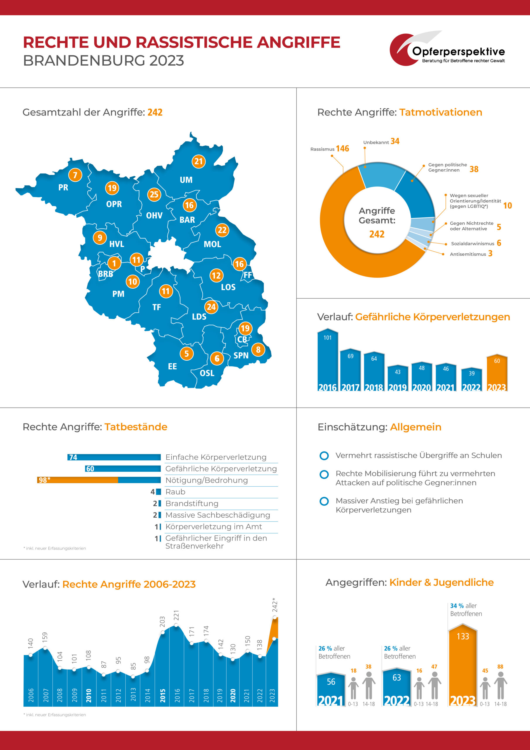 Potsdam, 18.03.2024 – Die Opferperspektive verzeichnet für 2023 einen massiven Anstieg rechter Gewalttaten in Brandenburg: 242 rechtsmotivierte Angriffe im Vergleich zu 138 Fällen im Vorjahr. Die Zunahme erstreckt sich über fast alle Phänomenbereiche und Tatbestände und markiert das höchste Niveau rechter Gewalt seit 2016.