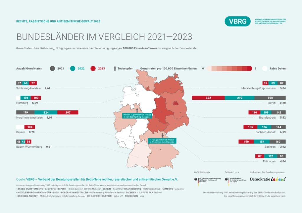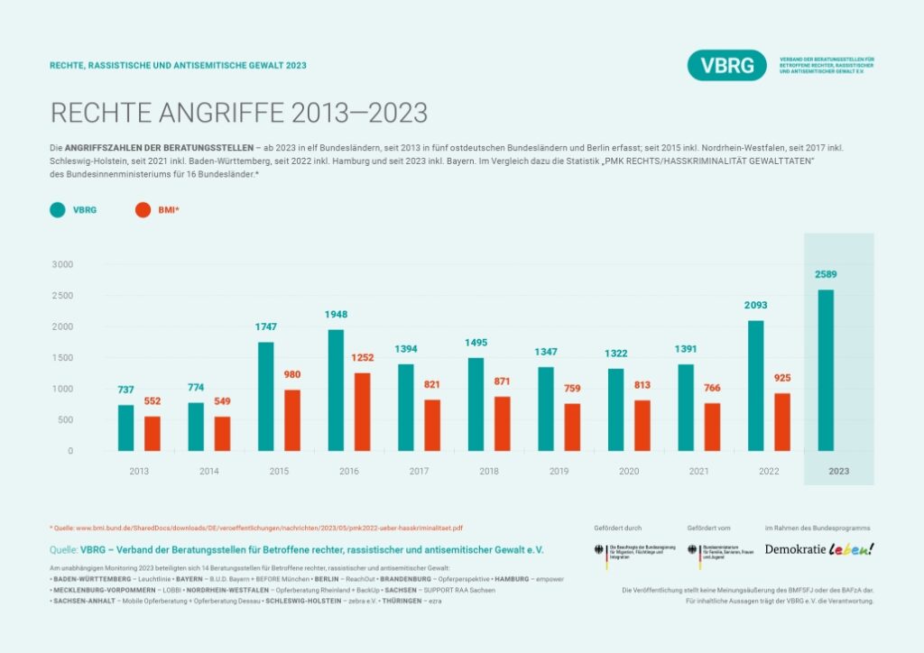 Die Beratungsstellen registrieren seit vielen Jahren rund ein Drittel mehr rechte Gewalttaten als die Strafverfolgungsbehörden und die Verfassungsschutzämter. Die Statistiken stimmen allerdings in der Erfassung der Zunahme von gewalttätigem Rassismus und Antisemitismus als Tatmotive überein.