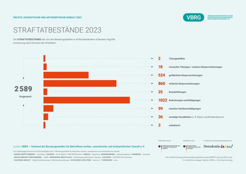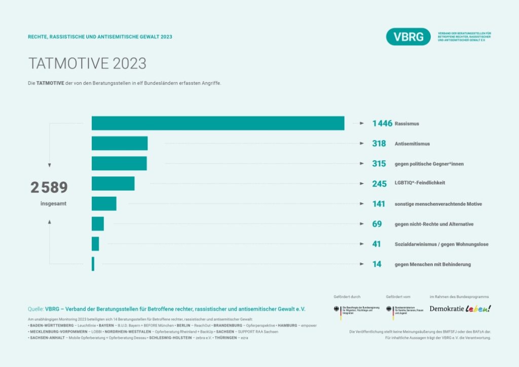 Die Bilanz der Opferberatungsstellen zum Ausmaß rechter, rassistischer und antisemitisch motivierter Gewalt im Jahr 2023 ist alarmierend. In elf von 16 Bundesländern wurden insgesamt 2.589 rechts, rassistisch und antisemitisch motivierte Angriffe mit 3.384 direkt davon Betroffenen registriert. Täglich werden damit durchschnittlich in mehr als der Hälfte der Bundesländer sieben einschlägige Angriffe verübt, bei denen Menschen zur Zielscheibe werden, weil ihnen im Weltbild der Täter:innen die Menschenwürde abgesprochen und sie als minderwertig angesehen werden. Körperverletzungsdelikte überwiegen und sind mehr als die Hälfte der registrierten Angriffe (2023: 1402/ 2022: 1.247). Sie sind um 12,43% im Vergleich zum Vorjahr gestiegen. Rassismus bleibt – wie in den Vorjahren – das häufigste Tatmotiv; die Anzahl rassistischer Angriffe ist dabei erneut um 33% gestiegen (2023: 1.446 / 2022: 1088) und richtet sich vorwiegend gegen Menschen mit Flucht- und Migrationsbiografien sowie gegen Schwarze Menschen. Die Täter kommen aus allen Altersgruppen, viele bekennen sich offensiv zu ihrer Gesinnung.