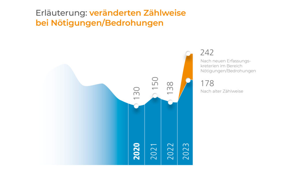 Die Opferperspektive hat für das Jahr 2023 die Erfassung von Bedrohungen und Nötigungen angepasst. Bisher fanden solche rechten Straftaten nur Eingang in das Monitoring der Opferperspektive, wenn sich Betroffene direkt an die Beratungsstelle wandten und schwere Tatfolgen vorlagen. Die Beratungsstelle hat nun die Erfassungspraxis an die bei Körperverletzungsdelikten bereits angewandten Maßstäbe angeglichen. Dies bedeutet, dass zusätzlich zu den bisher erfassten Taten alle Bedrohungen und Nötigungen, denen eine rechte Tatmotivation zu Grunde liegt und die polizeilich erfasst wurden, in die Statistik aufgenommen werden. Die Entscheidung für dieses Vorgehen wurde innerhalb des Dachverbandes der Beratungsstellen für Betroffene rechter, rassistischer und antisemitischer Gewalt (VBRG) getroffen.