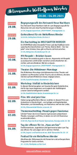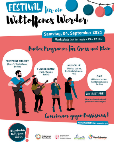 Vom 28. August bis 4. September findet in diesem Jahr zum fünften mal die Aktionswoche Weltoffenes Werder statt. Mit Kino, Theater, Strorytelling, Workshops und einem großen Abschlussfestival soll gegen Rassismus und Ausgrenzung und für ein weltoffenes und vielfältiges Werder ein Zeichen gesetzt werden.