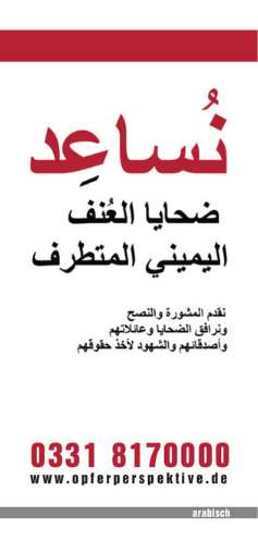 المعلومات المتضمنة في هذا المنشور لا تستهدف المتضررين من العنف اليميني وحسب، بل أيضًا أقاربه وأصدقائهم وصديقاتهم، أيضا الشهود والشهادات. العنف اليميني يمكن أن يكون عنفا جسديا أو لفظيا. العنف اليميني يمكن أن يحدث داخل المدرسة أو في إطار العمل أو في الأماكن العامة أو في شكل خطاب عدواني في الإنترنت. أنتم من يحددون إن كان الاعتداء بدافع عنصري أو نابع من أفكار يمينية. هل تعرضت من قبل الي حادثة إعتداء؟ هل سألت نفسك لماذا غض الناس اللذين كانوا قرب مكان الحدث أنظارهم عني؟ كيف لي أن أواصل حياتي كما اعتد و أتحرك بدون مخاوف بعد الإعتداء؟ كيف يكمن أن أحمي نفسي بدون أن أحجم من حريتي؟يمكنكم التواصل والحديث معنا في حالة أنكم لستم متأكدين إن كنتم متضررين من مثل هذه الإعتداءات أم لا. في حالة أنكم تعرفون أشخاص تعرضوا لاعتداء من قبل اليمينين وتريدون أن تخبروهم عن جمعية أوبفر بريسبيكتيفة، يمكنكم الحصول منا علي عدد أكبر من الكتيبات وتوزيعها.