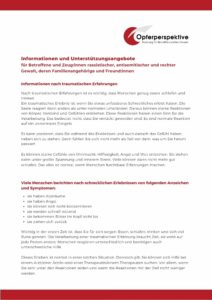 Wenn Sie eine Möglichkeit haben, Betroffene und Zeug:innen rechter Gewalt oder potenziell Betroffene auf das Beratungsangebot der Opferperspektive aufmerksam zu machen, können Sie das Faltblatt – auch in größerer Stückzahl – gern bestellen, verteilen und auslegen.