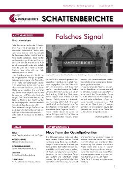 In Schattenberichte informiert die Opferperspektive regelmäßig über die Arbeit mit Opfern rechter Gewalt. Der Rundbrief erscheint zwei Mal im Jahr und hat vier Seiten. SpenderInnen und Fördermitglieder erhalten die Schattenberichte regelmäßig.