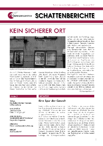 In Schattenberichte informiert die Opferperspektive regelmäßig über die Arbeit mit Opfern rechter Gewalt. Der Rundbrief erscheint zwei Mal im Jahr und hat vier Seiten. SpenderInnen und Fördermitglieder erhalten die Schattenberichte regelmäßig.